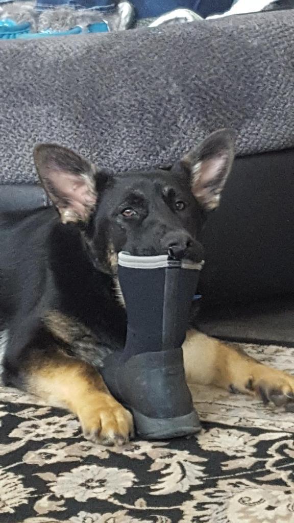 German Shepherd puppy 6 months old. I know im not suppose to chew my moms boots so i will just rest my head for awhile.