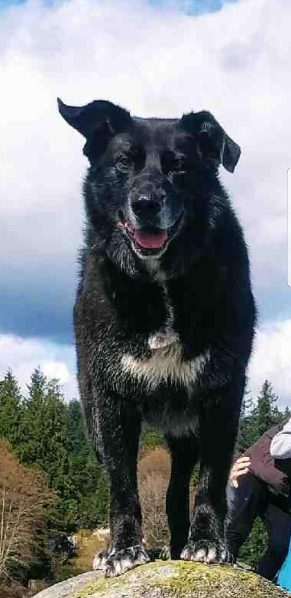 Animal BioConnor came to us from Williams Lake - through the West Van BCSPSA. He was found thumbing (pawing) a ride at the William's Lake truck stop, and a kind trucker picked him up and brought him in. He was high-tailing it outta there on a grand adventure. He's been with us for just over 5 years now, and he has really changed our lives. He is a gentle soul in the body of a beast - and has several times scared local hikers behind trees as they think he is a bear. But when they get up close to him they see his kind eyes and big smile. That smile!