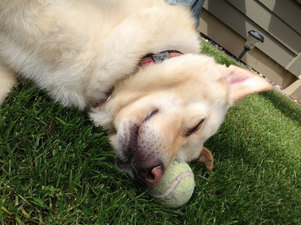 Animal BioAfter pleading with the staff to accept our application for her, we picked up Sadie from the Vancouver SPCA and she came straight to my miserable downpour of a soccer game. That first night, she was out cold with a toy in her mouth and we were all immediately smitten with her. That was January 2005 at one and a half years old. This photo is of a happy summer day spent outside about four or five years back - in her element of basking in the sun, with a ball close by. Although she has now lost her hearing and undergone an ACL surgery, she is still going strong and we thank our lucky stars that she has provided us with so much love since that first day!
