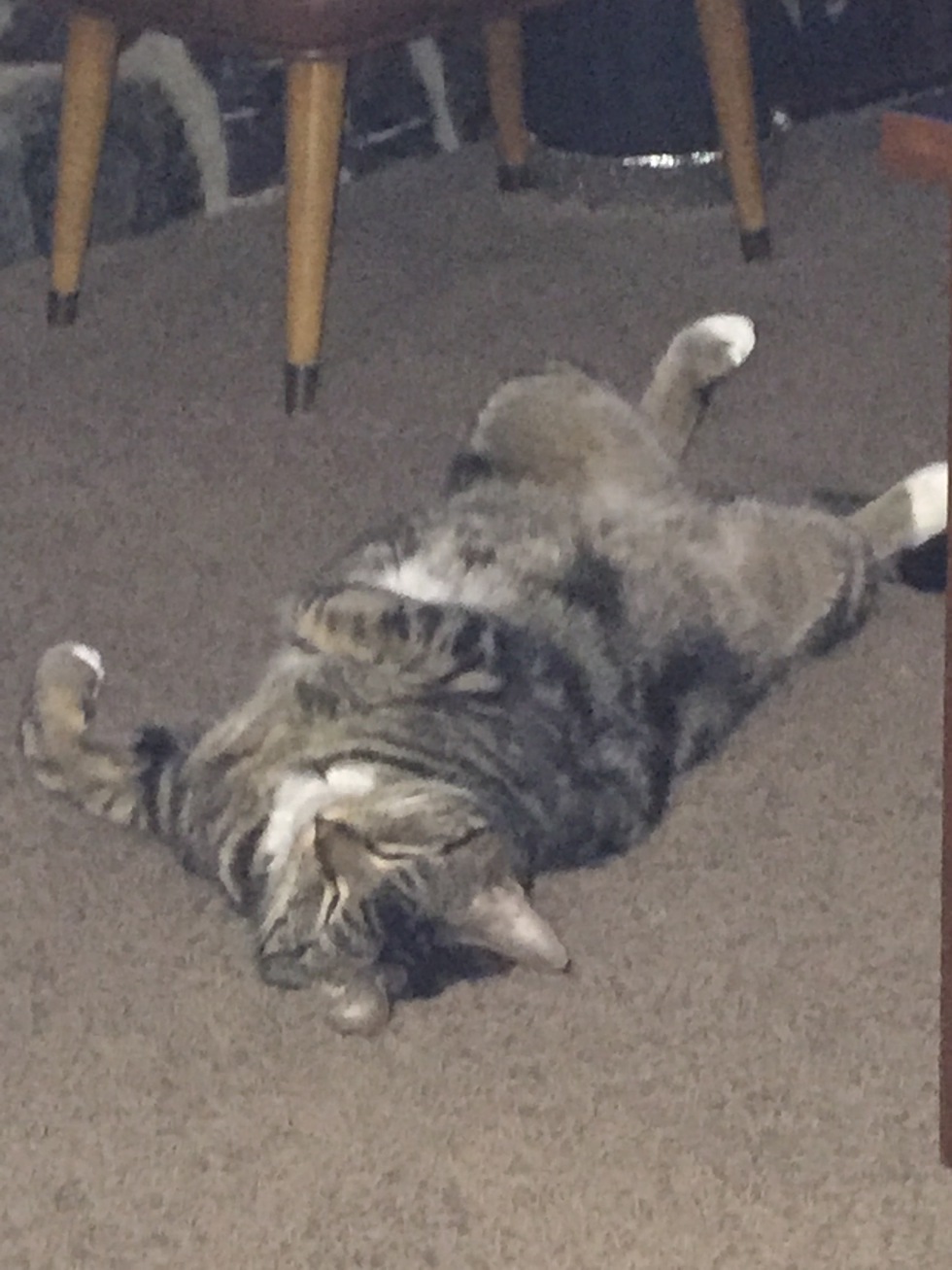 He is lounging in front of the hearth after having his fill of some tasty dinner