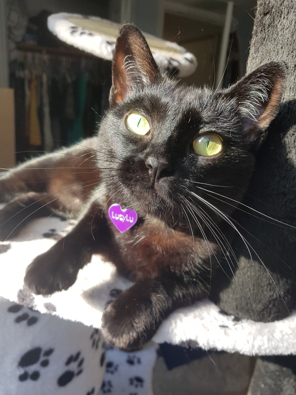 She is very affectionate toward me. She still reaches out her paw when she wants to be pet. She often lays on my chest while I pet her. At these times she likes to give me love bites & her nose drips. She can also be fiesty & loves to lay on her cat tree & play with peacock feathers. Minnows are her favourite treat. Lucy tolerates her sister Lacy. This girl brightens my days & is my emotional therapy. I'm so grateful she is mine! 🐱💜