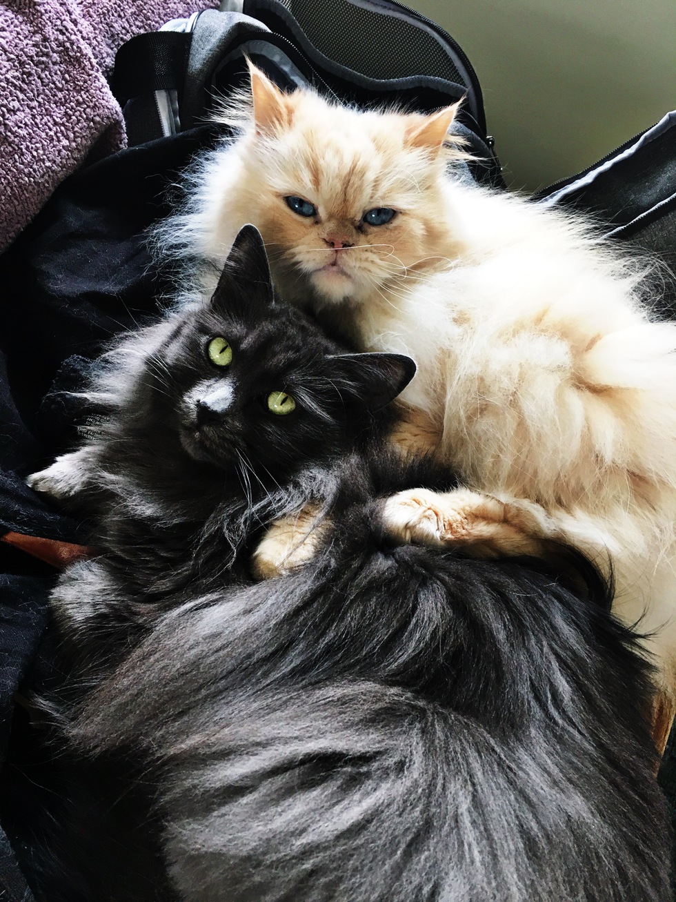 Animal BioBoth BCSPCA rescues, Beverly(grey) loves to find where Frederick(cream) is sleeping, walk right over to him and flip down, not beside him but directly on top of him to snuggle.