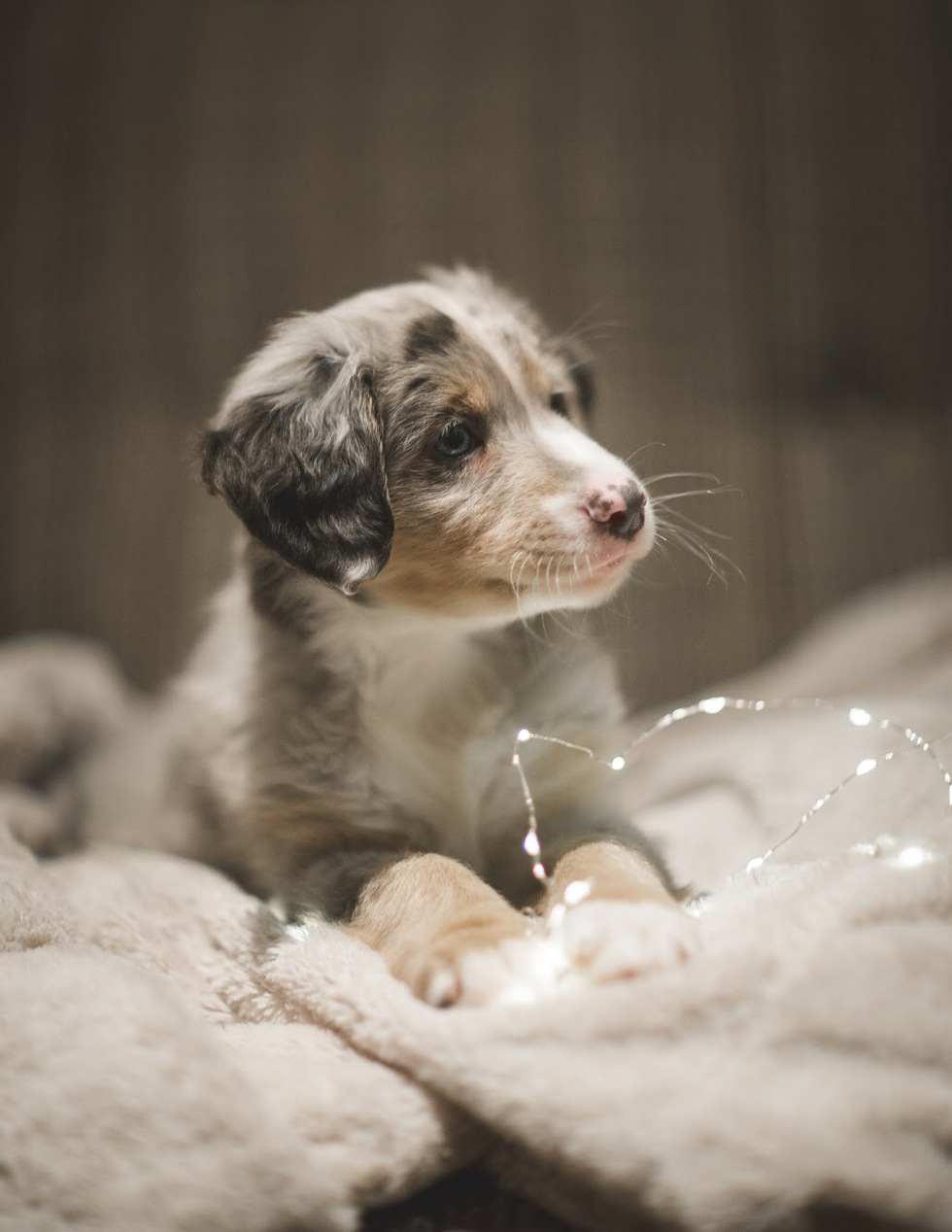 Animal BioOllie came from a litter of 7 puppies was the only Blue Merle. He is now 3.5 months old (as of April 2018). He's very chill when he's hanging out with family and very hyper when he's got the zoomies. He loves meeting new people and other dogs. He will be starting puppy classes next week! He already knows sit, stay, come, kiss, paw, roll over, and in-your-bed!