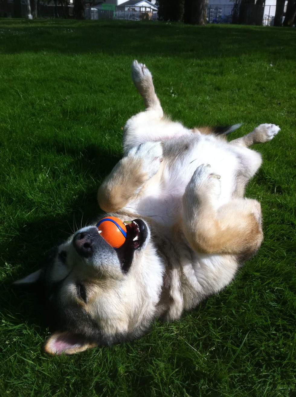 Deh Zona was born up north in May 2005. He is part wolf and malamute and has the most gentle nature. His most favourite things in the world are snackies and truck rides with dad!