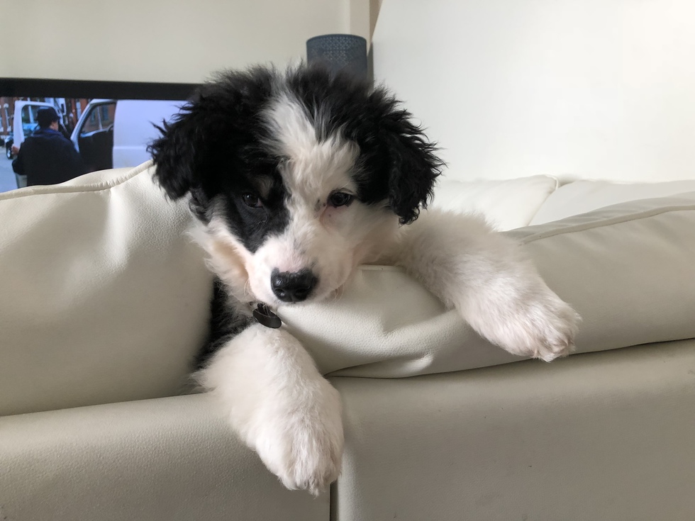 Po is a cross-breed, possibly Australian Shepherd and/or Border Collie cross. He became a permanent member of his household when his foster family adopted him shortly after his arrival on the West Coast. He loves everyone, including the two kids that are helping care for him and raise him.