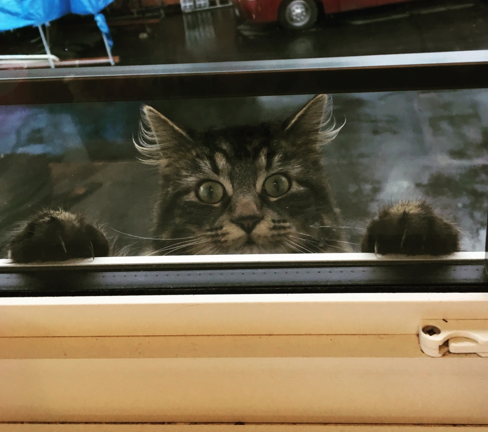 Maincoon kitty peeking through the window from the rooftop