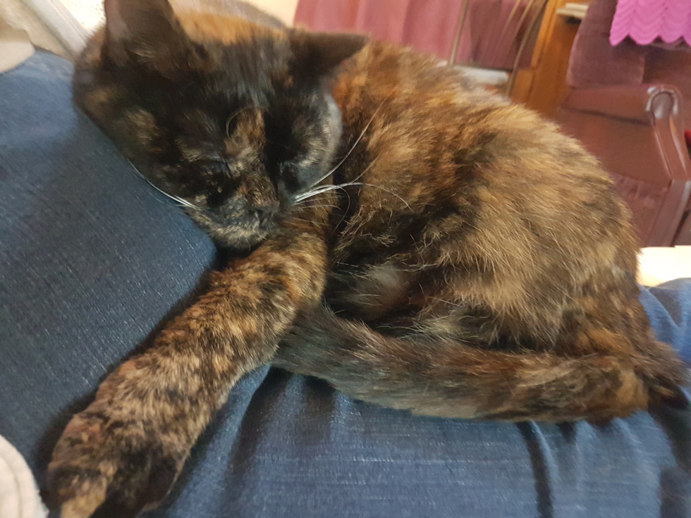 Animal BioWhen I first saw Grace at the Victoria, BC SPCA in February 2016 she was recovering from having all but 3-1/2 canine teeth removed, having been surrendered for that reason. She was on her second round of antibiotics. I sat with her every day for 1-1/2 weeks before taking her home and we formed a bond. Over two years later and we are living in Mill Bay. This precious girl has so much love to give. She has blossomed into a chatty tortie, loves to snuggle up with "Mom" for a movie (picture). And what an appetite. She manages hard and soft food with no problem. She enjoys going out on the balcony and looking at the deer, bunnies and birds traveling around the woodlands behind our building. This is definitely her forever home, and she fills my heart with such love and joy every day. I thank all the wonderful people at the SPCA for what they did to help Grace and bring us together, and what they do every day to save animals from suffering.