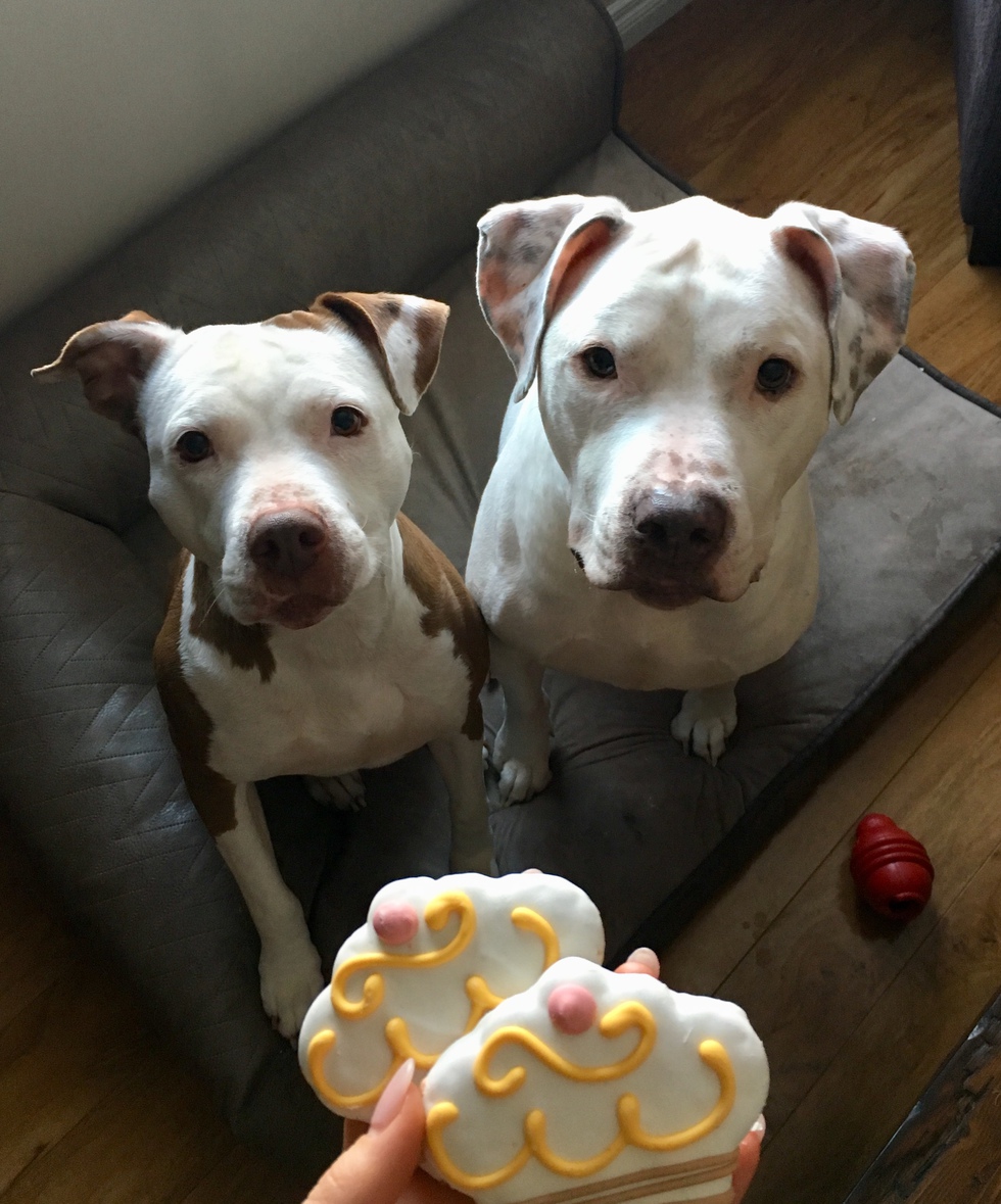 Tazanna's favourite activity is playing fetch with her ball. She will play for hours on end if there's someone willing to throw it for her! Bronco has had two knee replacements and it's hard for him to be active. His favourite activity is napping in the sunshine. He also likes to sit on peoples' laps...but he's over 100lbs so get ready to be squished!