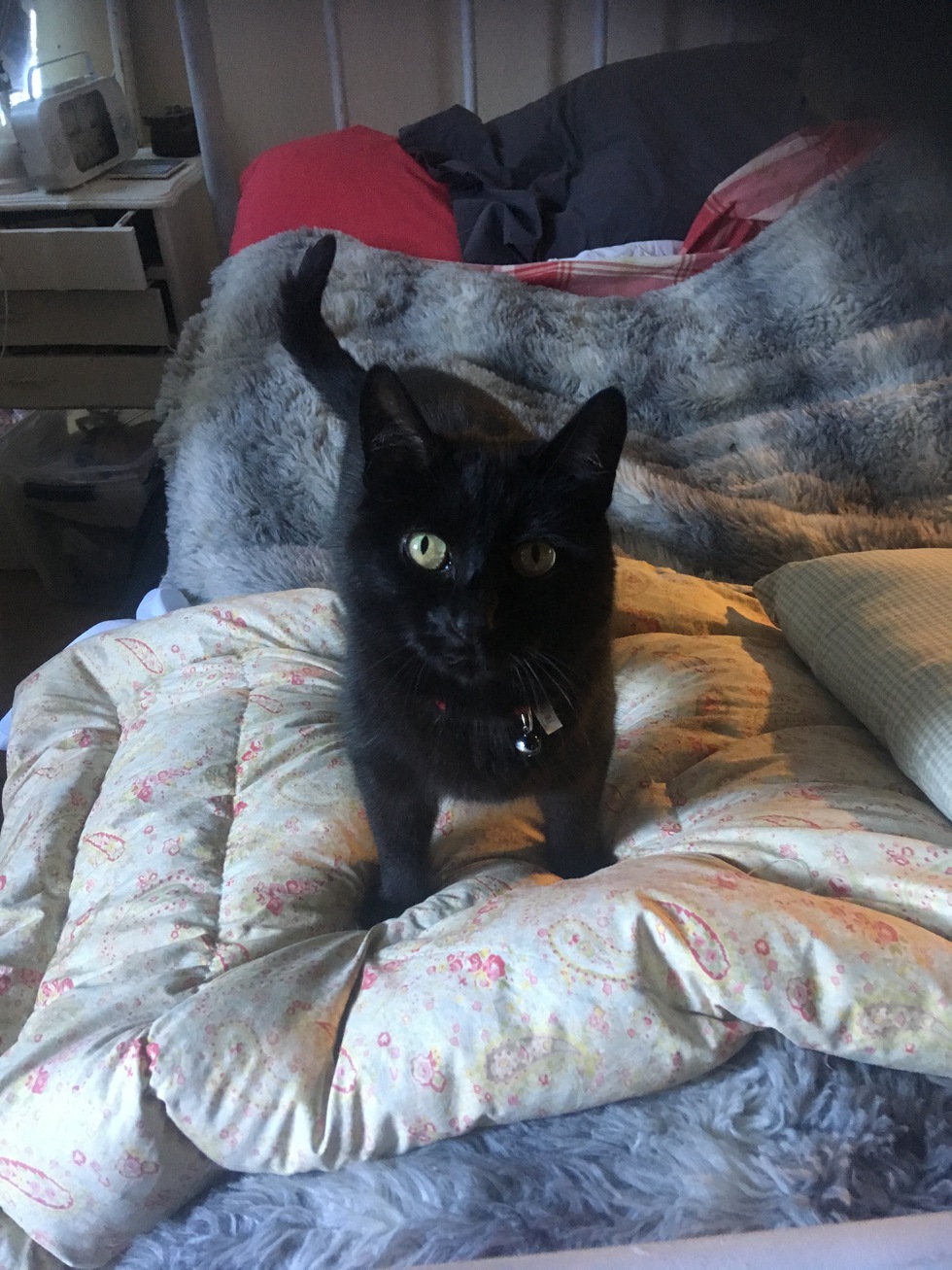 Loves her catnip mouse, and temptation snacks. She will stand by the special snack bowl to tell me she wants a snack. She travels with me in our Airstream and enjoys the adventures.
