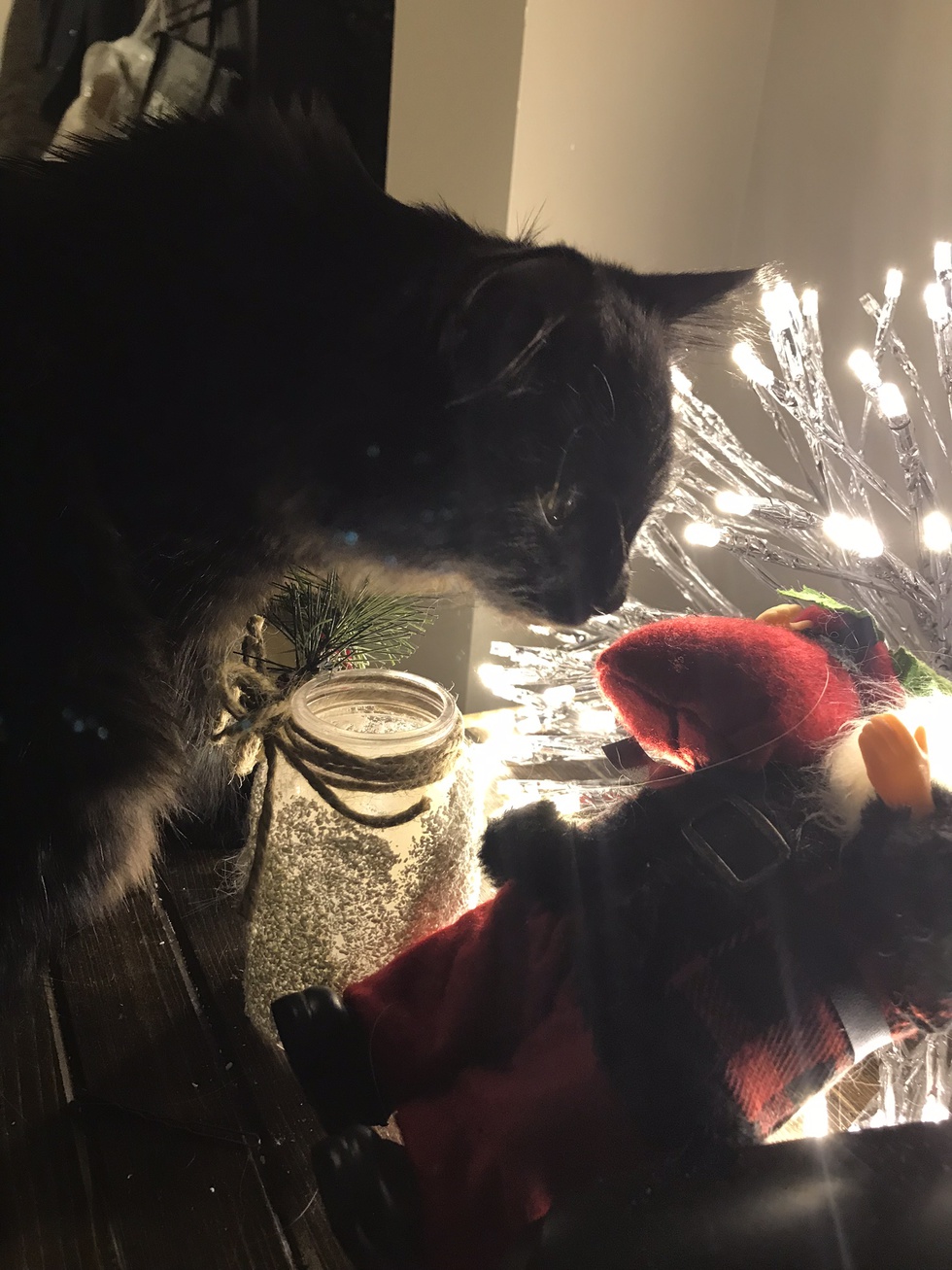 Animal BioKuro was a sweet, cuddly and curious kitten. He always sat and watched the twinkle lights at Christmas time just like this and out ate his 20 pound brother that was 3 years his senior! We so enjoyed the short time we had with him during the holidays and were happy he had a home he was loved in and could get comfortable in. He was a little scared when we first got him and didn’t want to leave the shrine of under the bed he created, but with a little time (and wet food on a spoon to coax him out) he was strutting around like he owned the place and sleeping on the bed where he belonged. We hope he’s enjoying his time on the other side of the rainbow bridge and we miss him dearly.
