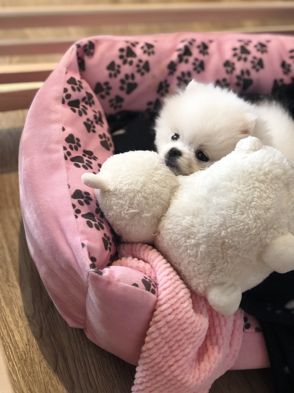 Pompom is a white pomeranion , blue eyes, one and a half killogram.