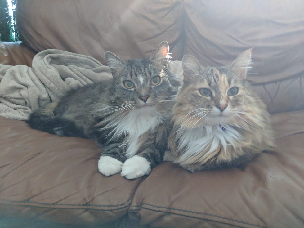 Animal BioShuna was found on Chief Lake Road {on the way home to Ness Lake (35km NW of Prince George BC)], as a kitten that had been poisoned by Malathion, but had made it as far as the Road on this very Hot summer's day. Driving home my wife and I spotted her and brought her back to good health, and awaiting her return to good health so we could Spay her, she became pregnant with twins. Samphrey survived the birth, and notably his father was of the Maine Coon Cat Breed. They sleep near each other, take care of each other, and Samphrey and Shuna are the closest together of my Five Cats.