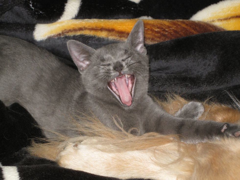She appears to be gray with blue/green eyes, but in pics, she has dots and stripes that show up. Her favorite time to play is of course early morning, as she chases her balls or bottle caps. She sleeps often in the retriever beds or with them on the human bed.