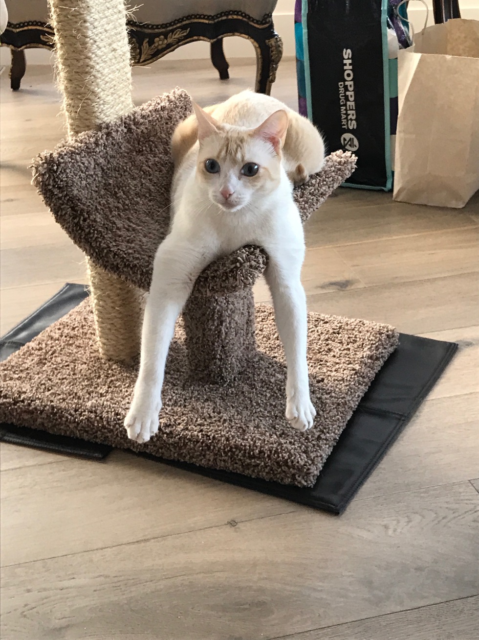 Animal BioSkye is a Siamese white & tan kitty. She is 2 years old and has blue eyes. Skye was a rescue cat from Mexico ! She does yoga (as you can see). She is extremely smart and active.