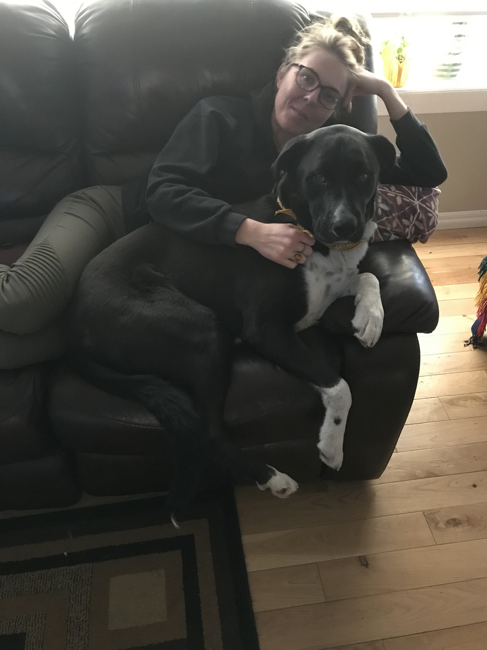 At some point He was given to a family member when his parents moved off the res & into a small apt in Town, & couldn’t take him, he was then passed on to a friend of the family where he was left to his own devices with another dog to survive out in the field at a unattended farmhouse, & was then that someone brought him to the SPCA ( no idea what happened to the other dog) at least this was the story I was given so really I have no idea his past life, what I do know he was under weight and had worms & was 2 yrs old when we adopted him. He is now 4 at a healthy 95 lbs he’s happy and loved by everyone who he meets, he loves people and kids but doesn’t get along with his own kind however when we brought him home he met Cooper our son’s dog they are still sorting out their Alpha but 90% of the time they get along, it’s a work in progress! I am told I got lucky when I picked him at the Shelter but I tell them we just went there to walk the dogs and pet the cats, after a week or so of doing this the staff informed me that Bubba would go crazy as soon as he saw our car arriving he knew we were coming it was then I noticed his excitement each time we stepped out of the vehicle we made a point to walk him last and keep him with us the longest & it was then he really pulled on my heart strings, it was so hard after that to leave him at the shelter, being such a big dog I was at first unsure about him but that soon melted when his big amber eyes stared at me really looking into me that I knew it was time to bring him home. He picked me and my 15 yr old daughter we were his choice! We were his family! And the rest is history, pit bulls get such bad reviews and given his start in life he is the most amazing loving trusting protective pet anyone could ever ask for, Bubba is our gentle giant we love this boy and I know he loves us back, he loves to chase deer something we try to discourage, in fear of him getting hurt! he loves going for rides in the vehicle with his head hanging out going for runs in the Bush, going for walks and playing in the back yard with his favorite ball and he loves leaning on you to get as close as he can to you almost knocking you over but the sweetest thing he does is climb on you to snuggle when he is feeling all lovey, or hog the couch as he’s doing with one of my daughters in the photo lol.