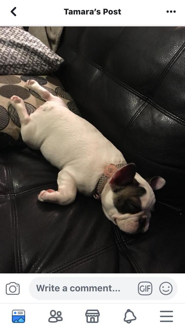 Lily is a one year old French bulldog. This photo was from the first night we brought her home in March of 2018. She was very active and then just passed out lol.