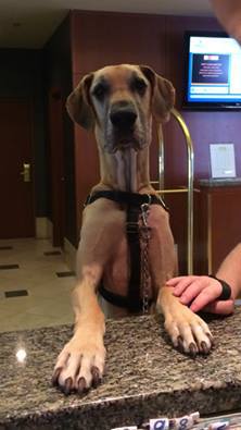 Animal BioMagna was a gorgeous 6.5 year old female fawn Great Dane who passed away from bloat last December. She touched deeply those that met her and the photo shows her checking in at her favorite hotel, The Hilton in Richmond. She was very strong yet soft, loving and affectionate. She was a one human canine and treated her human as though they were married. She led him 3 times to 3 different jewelry stores expecting to be let in for shopping. She led him to a bridal gown making store twice expecting to be let in as well for shopping. She would sit beside him in the van as they drove together with her front left paw on his right knee or with her head nestled on his upper chest and shoulder while driving. Sometimes she would scratch at the back of his arm until he opened his hand to put her paw in his hand so they held "hands" as they drove together. Magna's love was unconditional and she also provided unwavering loyalty toward her human and he tried to follow her example to give back to her by her example of love towards him.