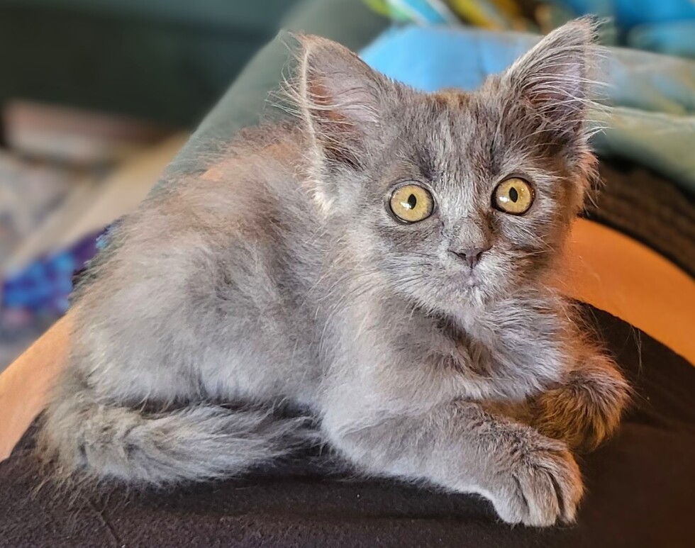 Giles is a 9 month old Persian mix. He was rescued by the SPCA as a kitten from a bad hoarding situation that even made the news. Since being adopted, he has been a superstar since day one. He is a chirping, purring, fetch playing machine. Giles even took to leash and backpack training and likes to come out to coffee shops and to the pet store to pick out his new treats. This photo is from his early days but remains a classic. At the time, we thought there was a good chance we'd adopted a tiny werewolf, and honestly the jury's still out on that, but he's also sweet as can be.