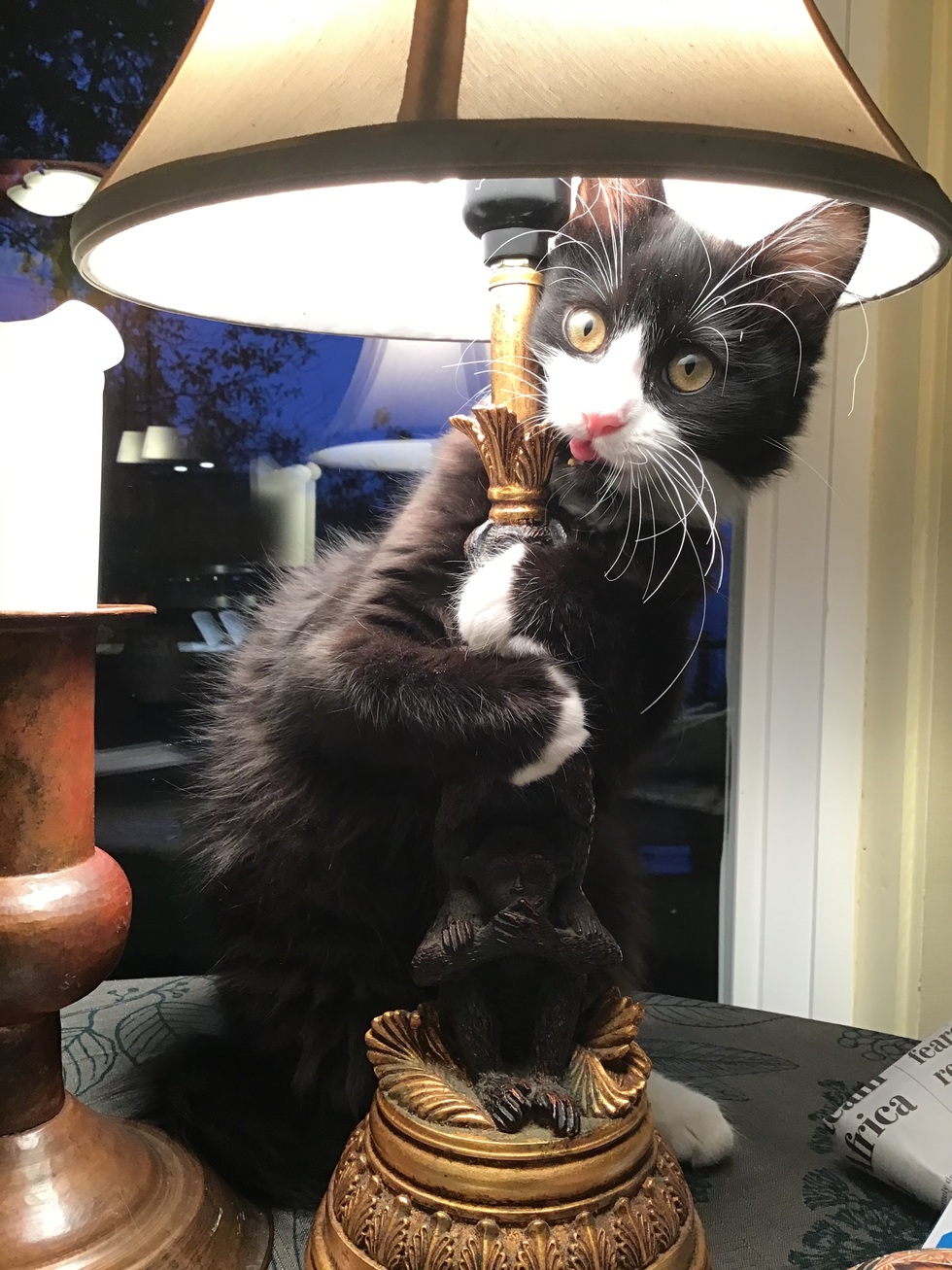 Animal Bioi found hugo as a 3 week old kitten. he had been dropped by a raven or eagle on his way to become dinner. injured and terrified he cryed so loud i heard him in my home and followed his voice. he could hardly walk and yet crawled through the vinca to my voice. i brought him to the cat group on the island and they set me up with necessities for his care. a few months previous i had to put down my beautiful boy migo and as he passed, i asked him to send me another kitty soul as wonderful as he was. some kittens were offered but they were not the one. what a dramatic way for migo to send me his replacement. i am grateful every day for my little brave kitty.