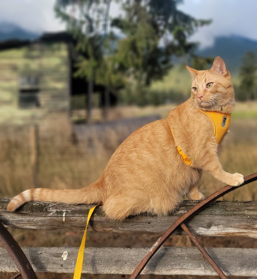 An adventure lover at heart, Sunshine enjoys going outside on a harness and will politely—yet persistently—ask in the cutest little squeaky voice for walks, grazing, and exploration time. When he’s not off adventuring, he’s a proud lazy boy who deeply appreciates kibble, treats, catnip, and quality lounging.