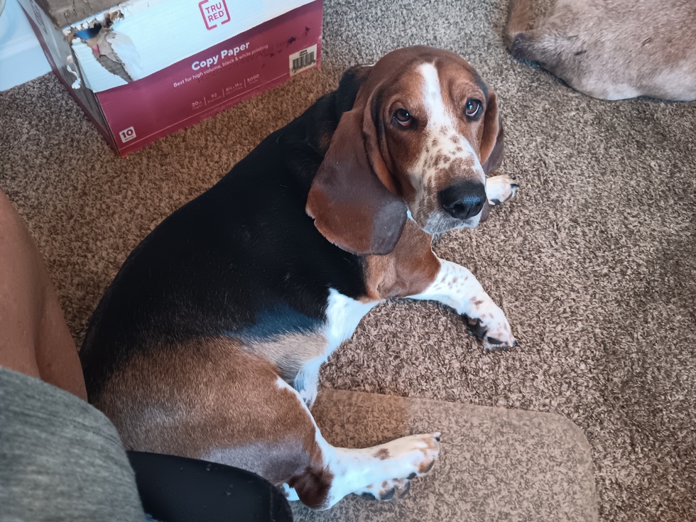 In April 2024, I was asked to rescue a Bassett from a county shelter. He had been found as a stray wandering a neighboring town. The shelter named him "Stinky" because he was very thin and did not smell very good. I brought him home and gave him a bath. I renamed him Wilbur. He started stealing my heart from day one. He began as a foster but soon became a foster failure. He is always into trouble and anything that drops on the floor is his. He is very active and there is never a dull moment with Wilbur!