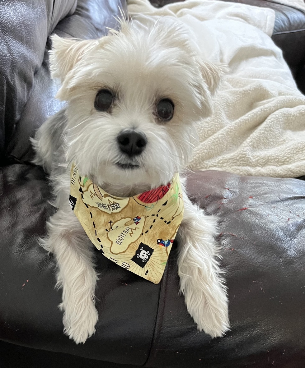 Rescued 10 years ago. Happy, fun loving dog that enjoys walks. Always wants to wear a bandana.