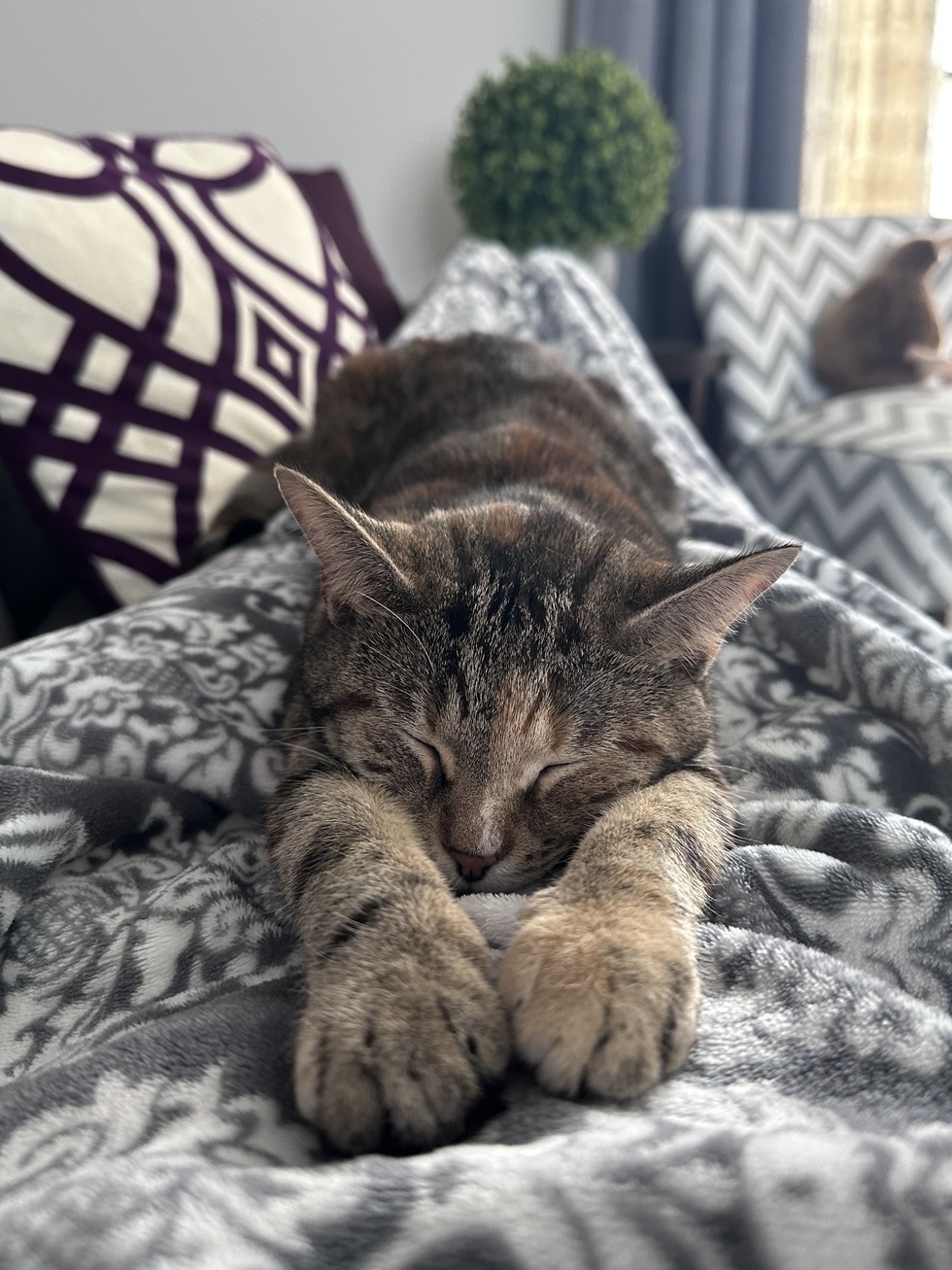 Meet Biscotti! This little lady found her home with us last summer, and has brought nothing but joy into our lives. We instantly fell in love with her playful spirit and adorable meows. The definition of a velcro cat, she always wants to be where the people are, following us up and down the stairs, throughout every room in the house, and will happily greet you with purrs, a tiny meow, and a big stretch showing off the softest belly in the world. She loves watching the birds at the feeder from her cat tree, and will sound the alarm and chatter to let us know they’ve arrived. She loves tucking herself in under a blanket, taking turns sleeping with different members of the family, and of course, making biscuits! We really did win the cat lottery with Biscotti.
