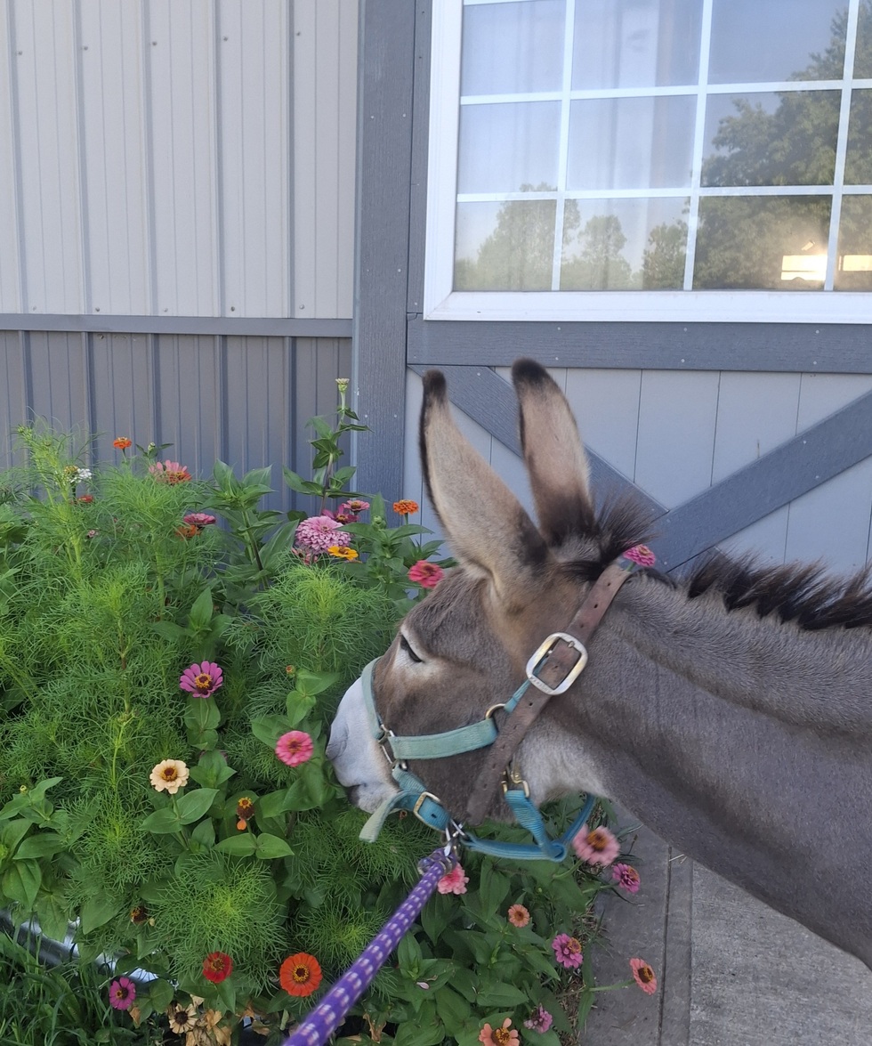 Mikey is a farm favorite. He is a busy boy and his curiosity makes him just the cutest. He has a beautiful singing voice and announces all his friends arrivals with a song. Mikey enjoys kisses, playing with his stuffies, grazing with his horse friends, listening to lullabies, chasing children and eating snackies. He has never met a Nilla Wafer he didn't enjoy.