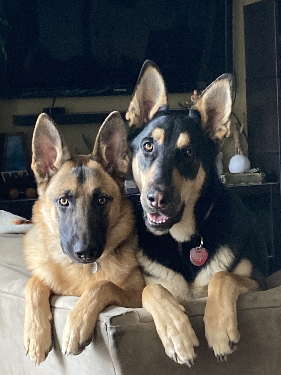 Both came from From Forgotten to Forever. Wiley came as a foster and had no idea what toys or indoors were even like at 9 mo old. We fell in love with his goofy and attentive nature. He learned quickly & he needed a friend. Zaio was a little head strong girl that needed a home, abandoned at 3 mo old & taken into FFTF care. She’s full of so much happiness she can’t sit still.