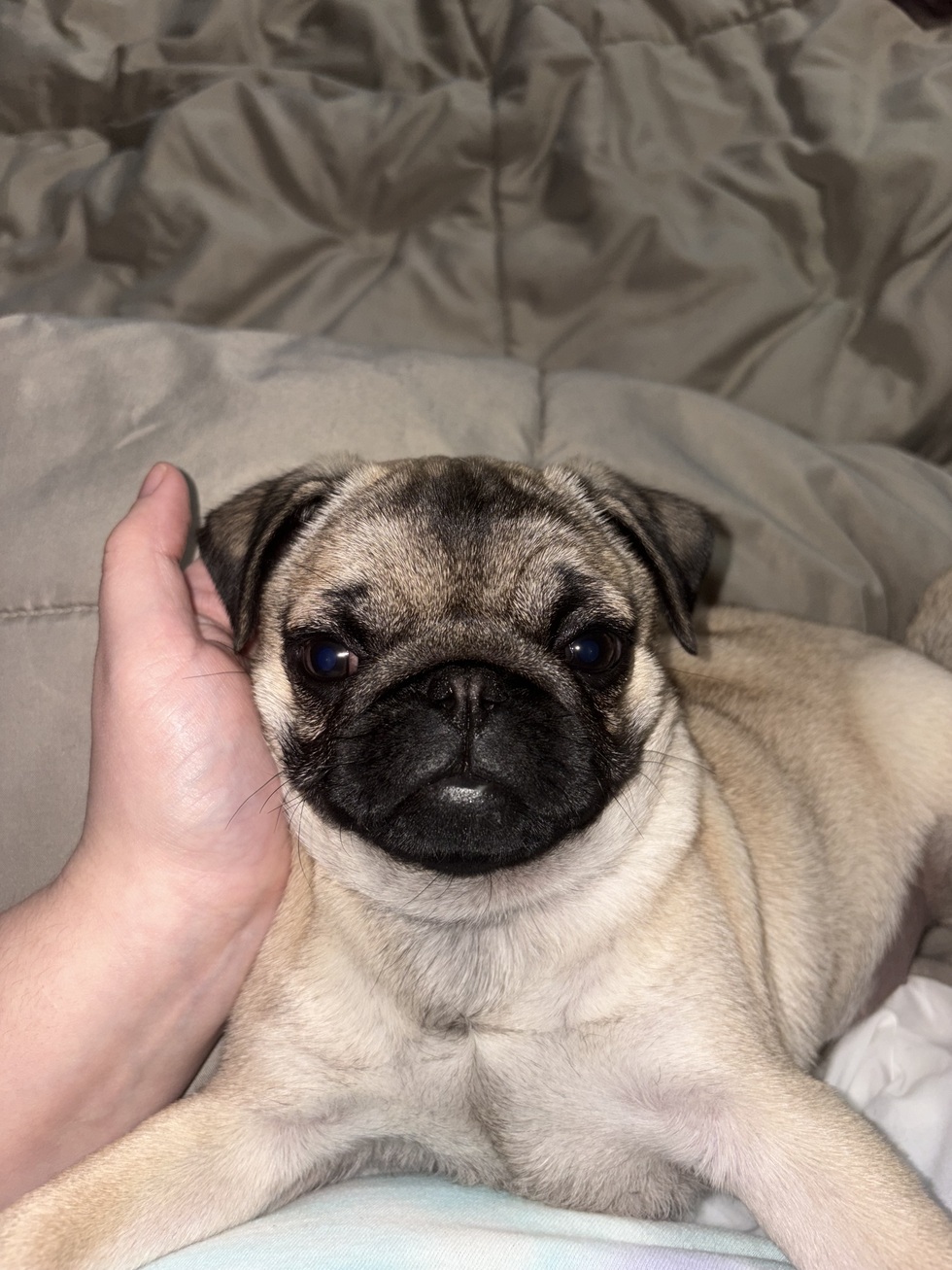Maple is sweet and petite, a tiny girl with a big personality. She is sassy and demands your attention with a bark that sounds like a squeaky toy. Her favorite thing to do currently is disrupt her brother Pancake’s sleep. Mae Mae loves lounging in her bed, jumping up for a quick round of zoomies, then laying back down for a power nap. She would love to be your Bluegrass Pugfest Queen at her very first Pugfest!