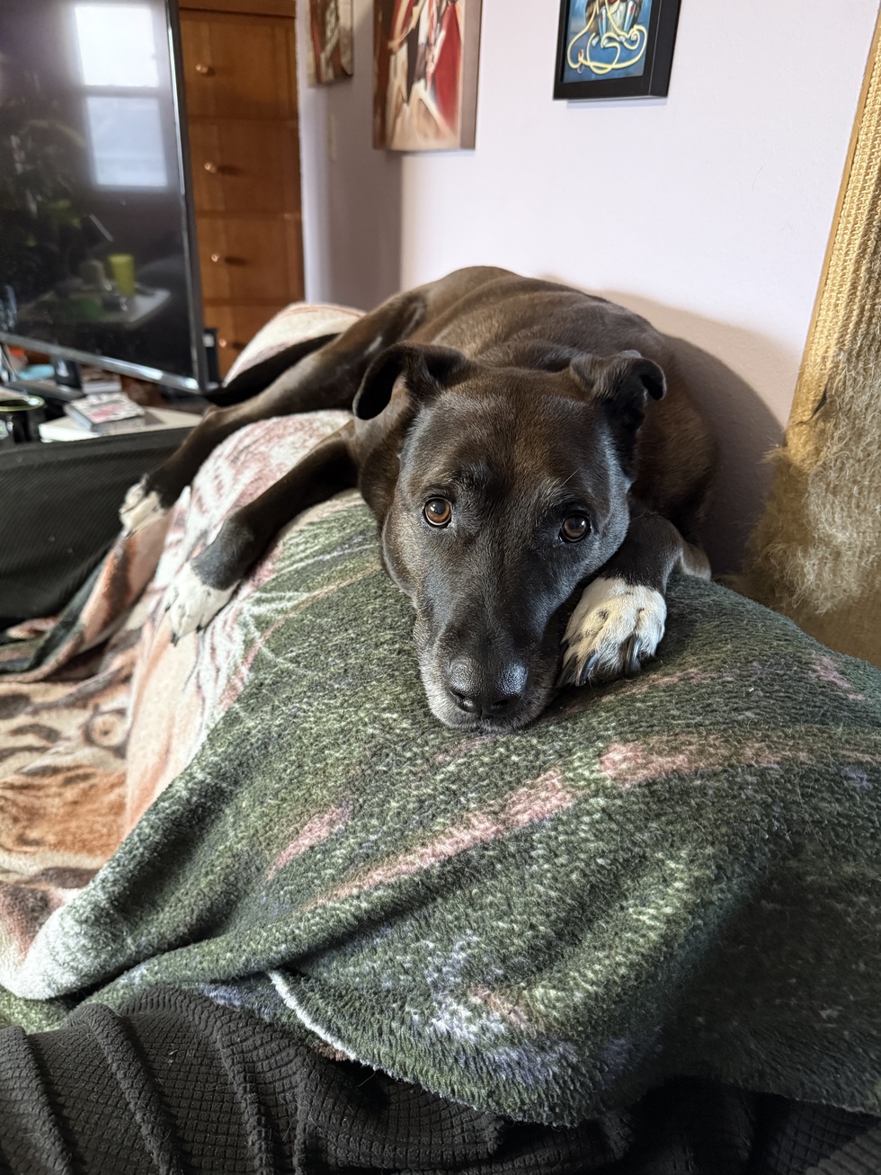 She’s a dog, technically—but in spirit she’s a small old lady who prefers not to leave the house. Most of her day is spent draped across the back of the couch where she keeps a careful watch out the window.