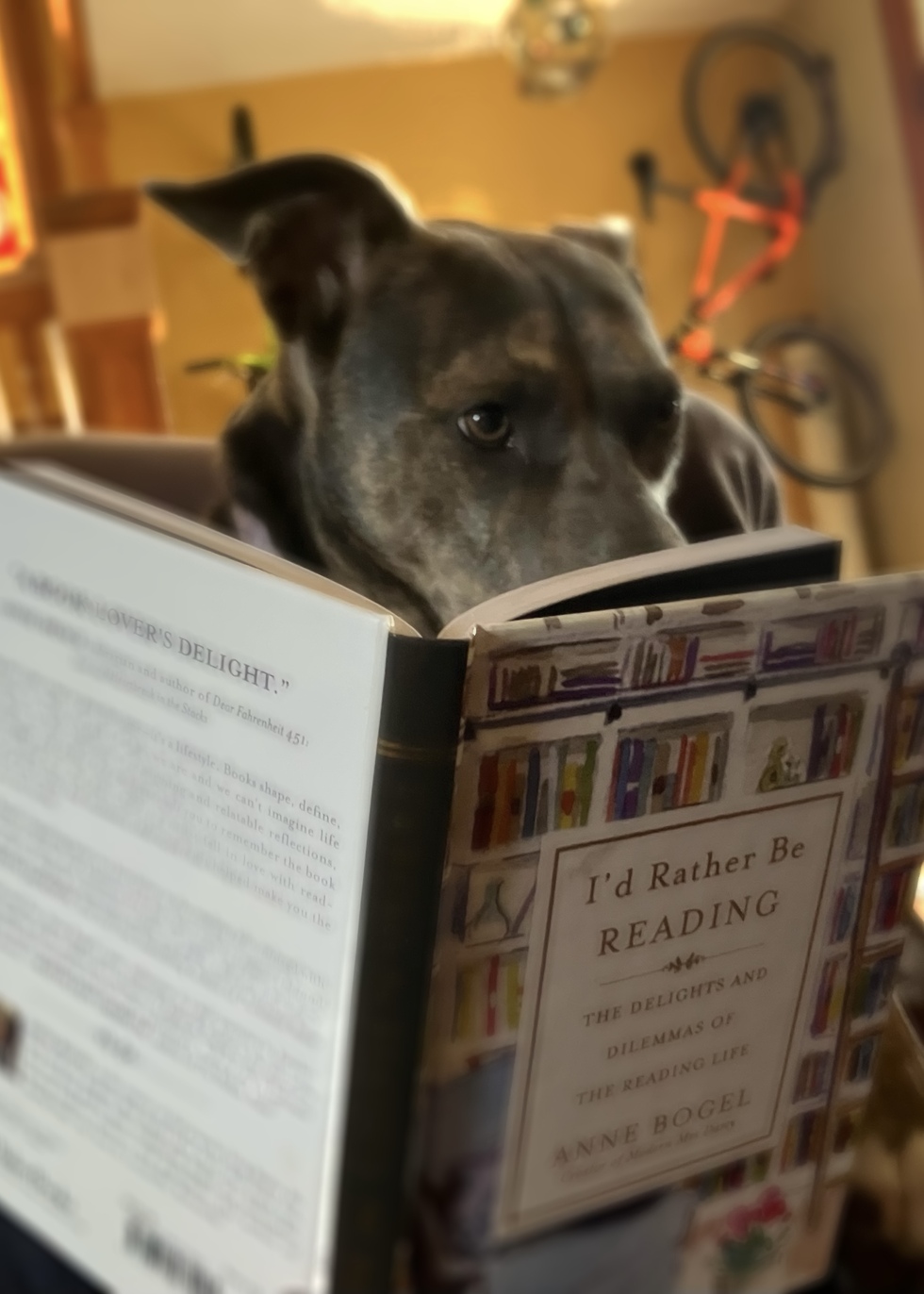Cleo is a rescue from Cincinnati Animal Care Humane Society. We believe she is a mix of greyhound and pitbull. She is very intense in everything she does, including giving affection and looking at this book!