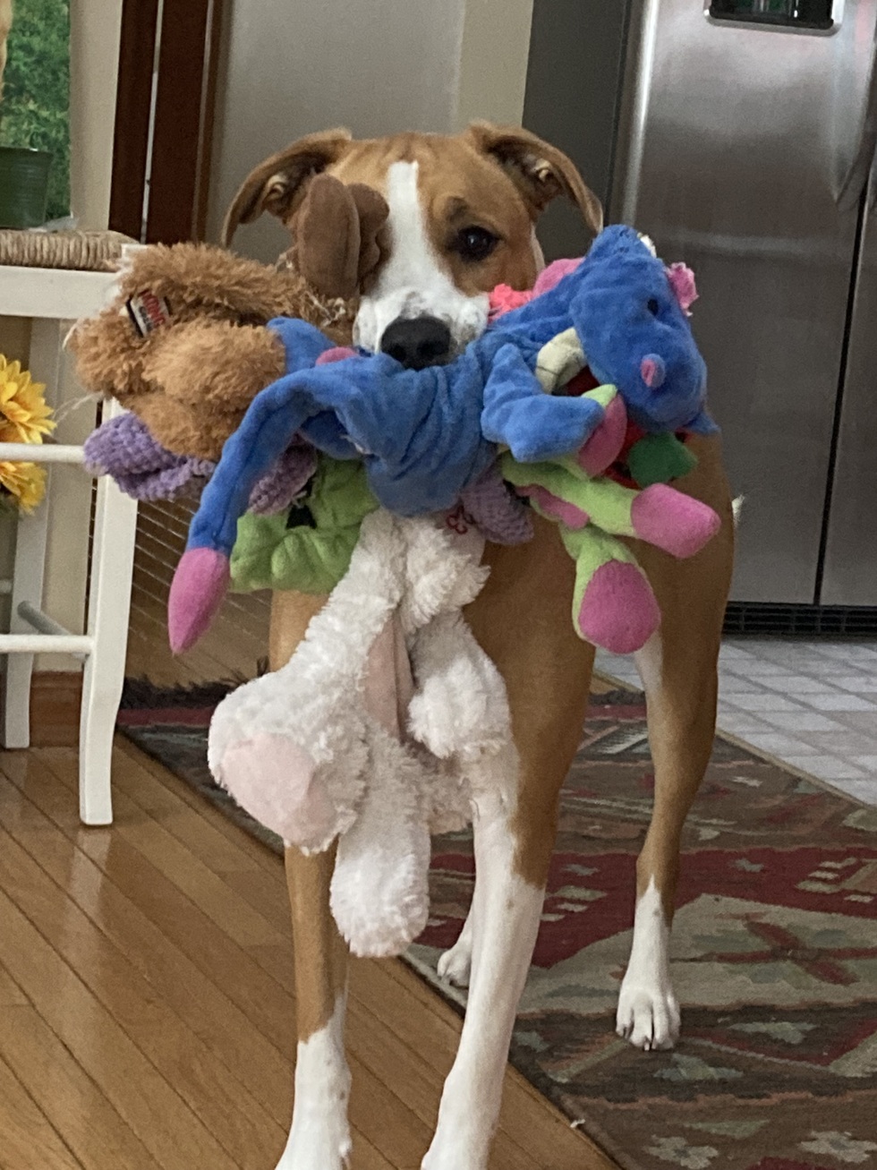 Freya is a 3 year old rescue. She is the strangest, snarkiest but smartest dog I have ever had. She carries her babies around all day, tucking them in our bed, bringing them outside, showing them to me, but I cannot touch them, LOL. She makes me laugh every day!