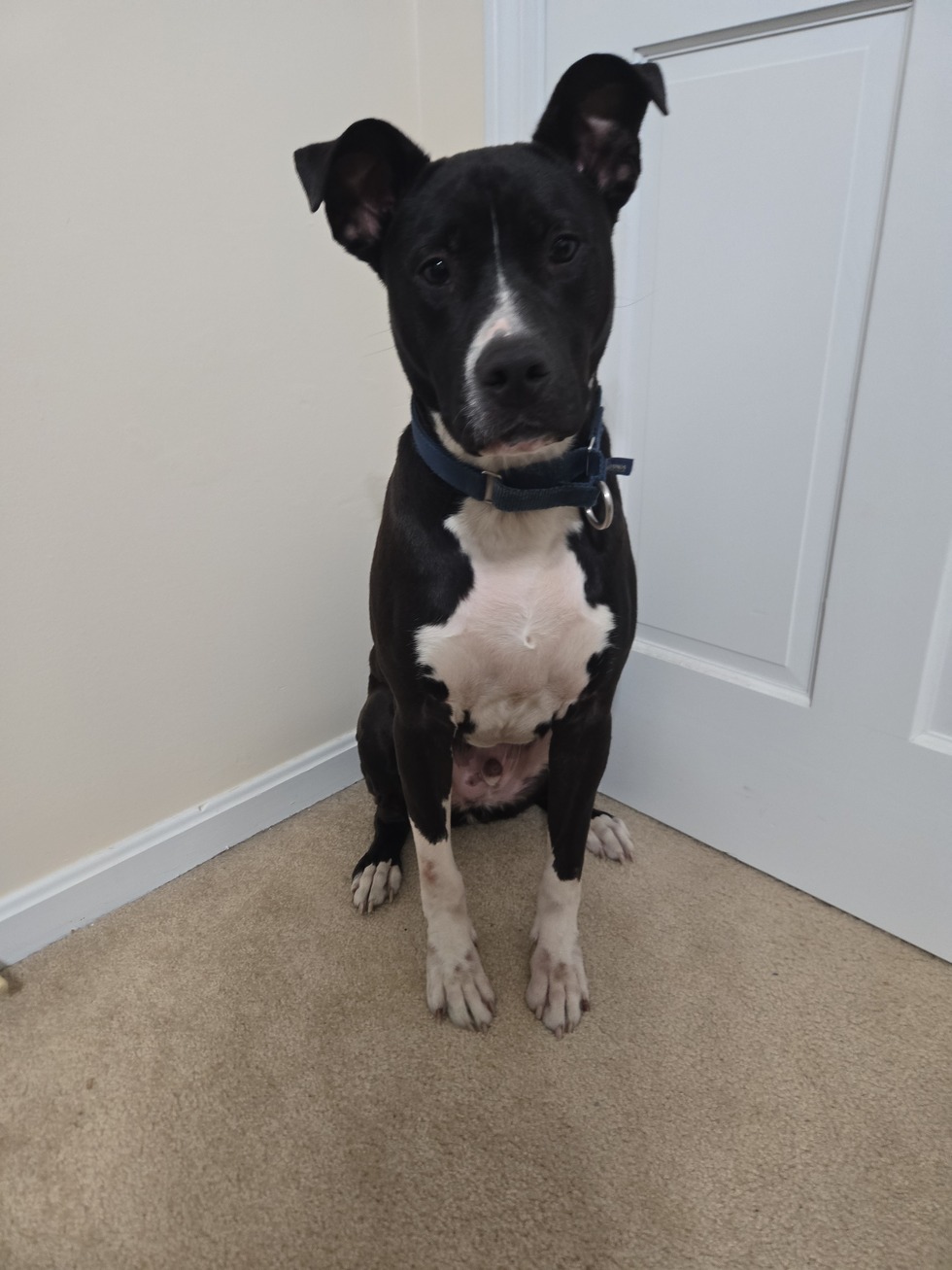 My daughter and I picked up scooter at a humane society . Hes pit/boxer hes been in the family for about 14 months . Scooter is bundle of joy my daughter and scooter have a wonderful connection together.