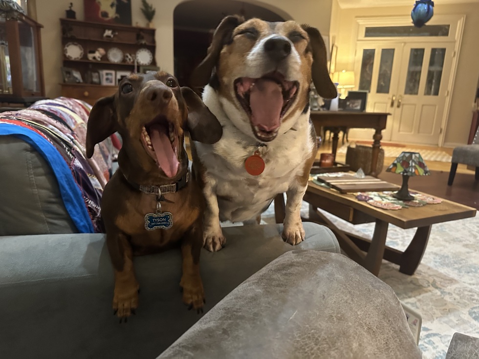 midget, with her best friend, tyson the dachshund. the two are inseparable and partners in crime. often seen doing zoomies at high rates of speeds around the house, they take no prisoners and leave devastation on their trail. no staircase is too steep, no obstacles keep them from gathering more speed and they terrorize the home. when totally worn out, they love snuggling together in a way too small dog bed gathering up strength for their next round of mischief.