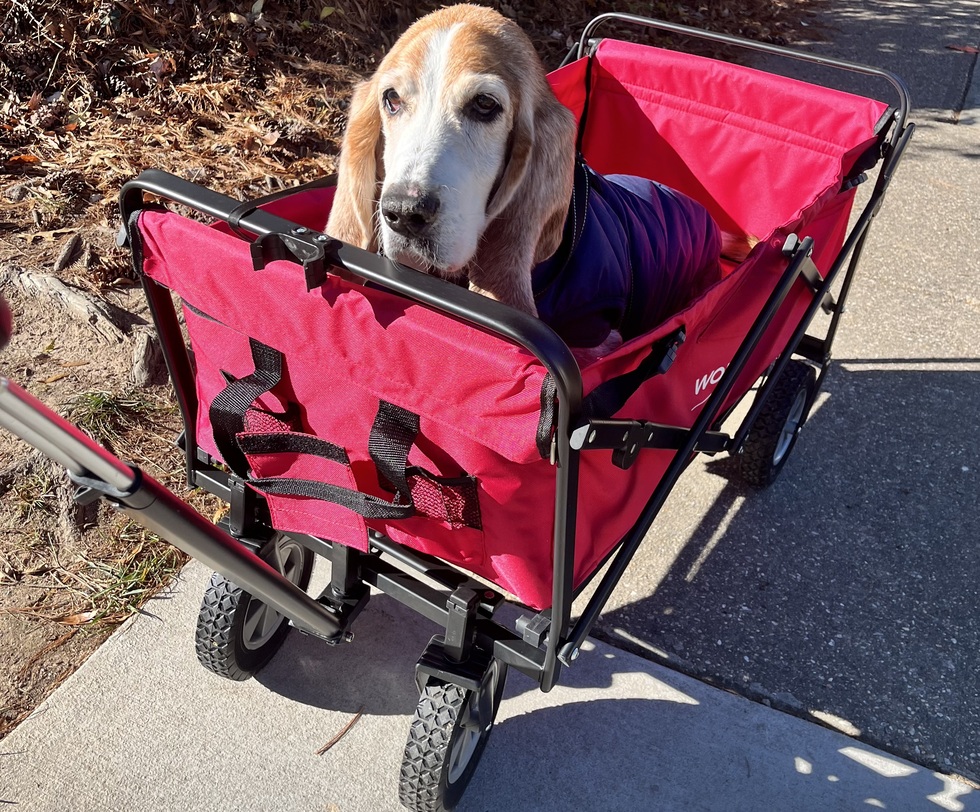 Brutus lived a happy life of 13 years and crossed the Rainbow Bridge in January of 2026. In his later months he enjoyed his wagon rides around the neighborhood accompanied by his sister Juno.