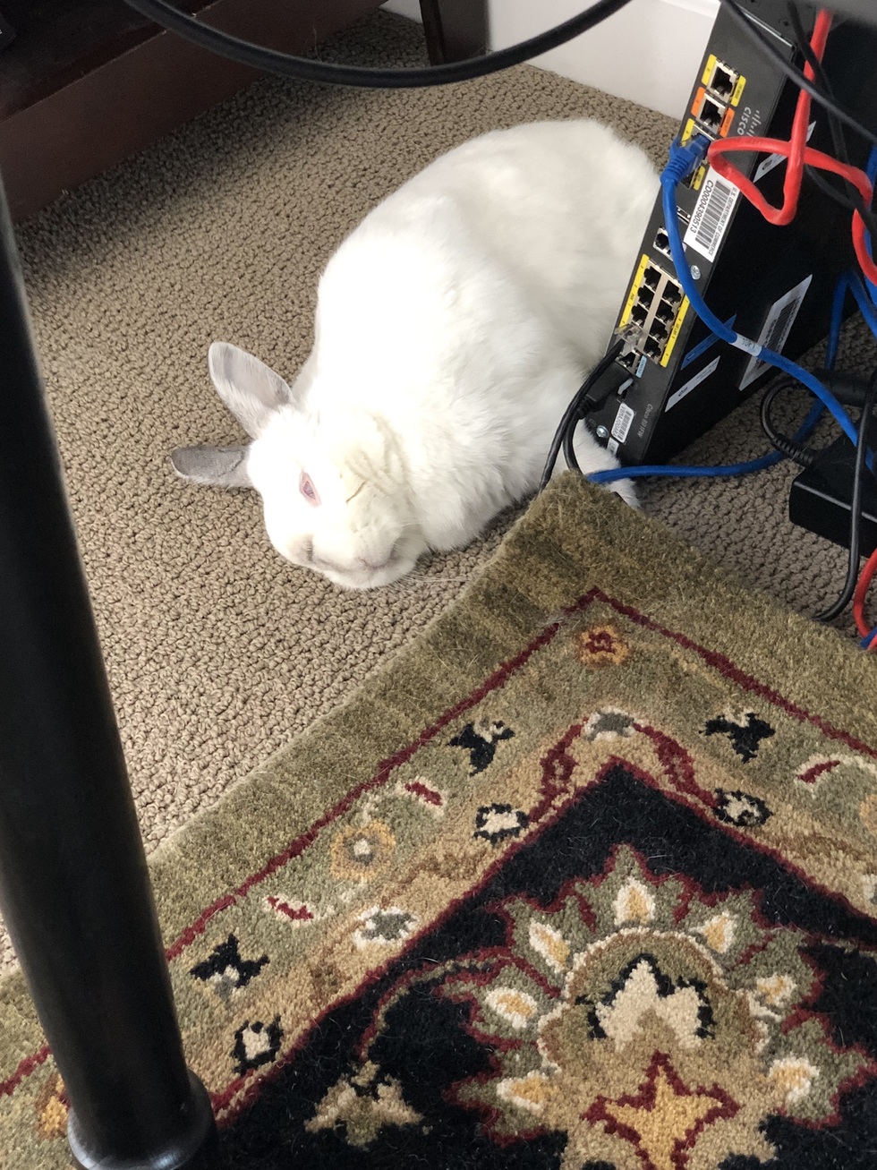 A little about me...Meet our wonderfully weird little bunny, Cream Puff! Adopted from SDHRS, her favorite place to be is snuggled up to the router under the human’s desk. She gives it kisses and thumps furiously if the humans get too close to her beloved router.