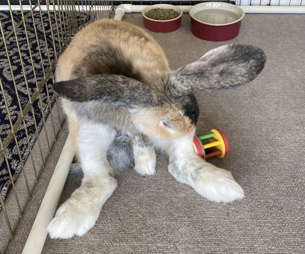 Silly boy Bungee sometimes sits in a very awkward position when he grooms himself! (Bungee is my 15 pound, 7-month-old Continental Giant.)