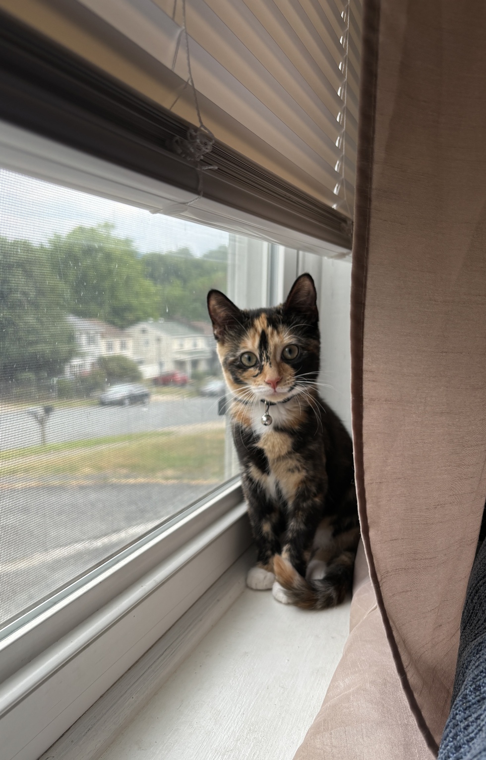 Pet's Story or BioHi my name is Kallie, I am small but mighty, caring and curious, fun and full of energy. When I wake up I love to rub my owners face and nudge her hand to get up. I am her alarm clock for the summer. I love having conversations with her when she fixes my food and she asks me if I am hungry and she is fixing my food, I meow to let her know that “Yes I am hungry”. I love playing with my owner and all the toys she has gotten me (which is a lot) as she watches me wiggle before I pounce on something or hide around the corner and jump out standing on 2 back legs with front paws in the air as to say “I got you” and laying in my cat tree looking out the window and when it’s finally time to settle down I curl up beside her enjoying all the love and rubs she gives. I needed her as much as she needed me. My name is Kallie, I’m a blessing and a ball of energy.