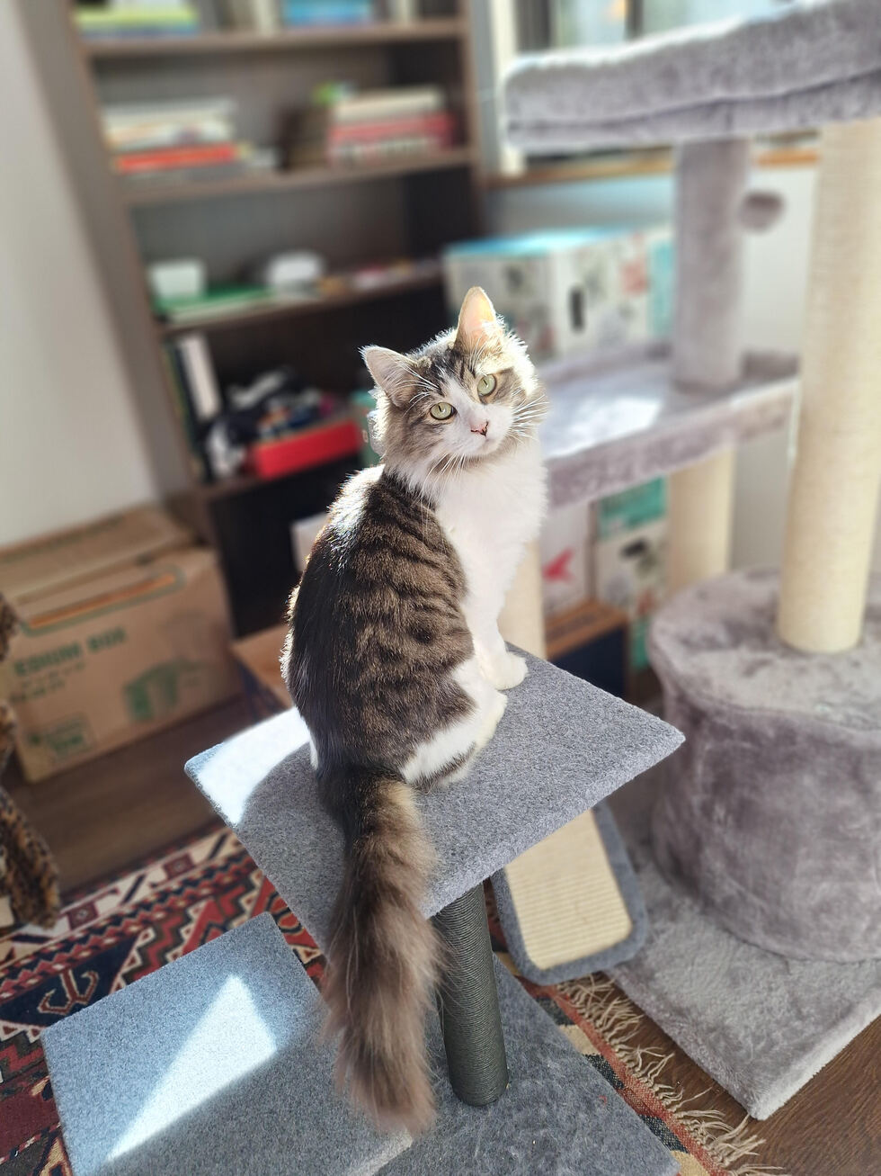Michi was adopted in July 2024. His rescue name was "Shark Boy". He was very thin and his fur was so sparse that you could see his skin. He has had some medical issues-intestinal and his eyes. And he's come through everything like a champ! He's still a little scared of strangers at first, but friendly, very smart and has the sweetest purr in the world. He has taught himself to make biscuits and never steals my blankets late at night.