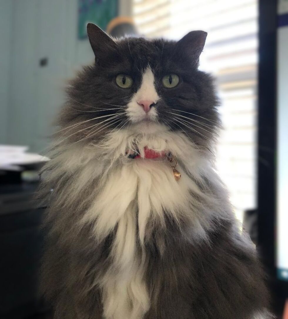 Pyewacket was one of three cats born in my backyard. At first , a couple of feral cats visited, then only the female cat visited When she stopped coming by, I just assumed that the fate that often lies in wait for feral cats had claimed both of them. Imagine my surprise when Mom returned with three tiny balls of fluff. Eventually Mom and 2 of the kittens took off, but Pyewacket stayed behind. One day, she had a terrible fight with a fox, and I decided she'd be an indoor cat from that time on. She's quite shy but is the most mellow, sweetest little girl. Her favorite pastime is eating, so the other cats rely on her to keep me on schedule when it comes to feeding time.