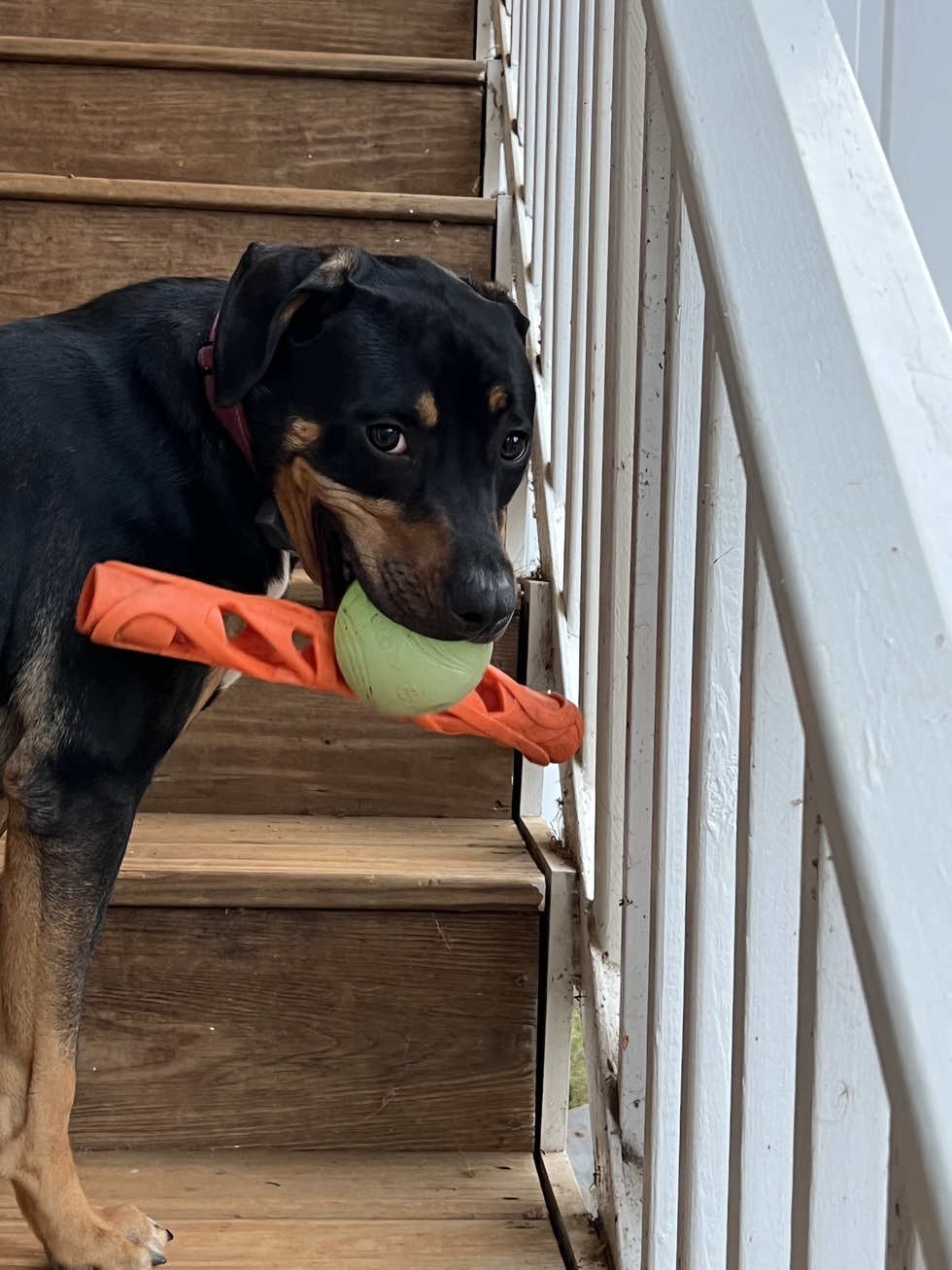 On a trip to pick up a CASPCA 2025 Calendar, we decided to stop by and see the Disney litter of puppies and immediately fell in love with Brinabell (Mini at the time). She is a bundle of energy who loves playtime with her older brother and sister (and her toys) and is ever the optimist that the cats will eventually love her as much as she loves them. She has so much excitement at times that her short tail can't keep up, and she ends up wagging her whole backend which inevitably leads to more pets and even more excitement.