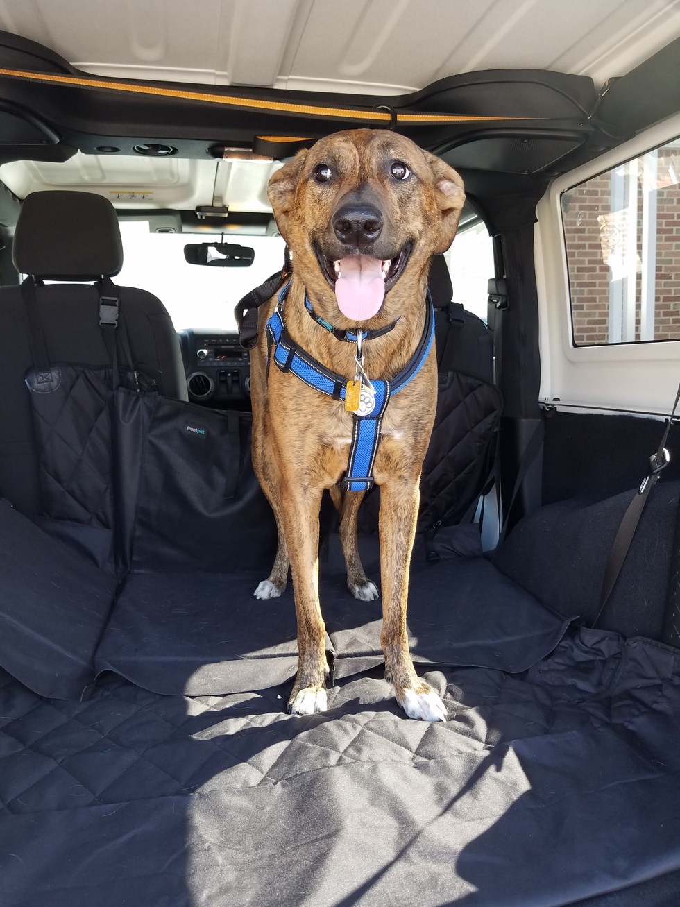 Never one to be outdone by her younger brother, please consider Miss Zoie!! She's is more the outdoorsy type as seen here in "her" Jeep. Those long legs of hers and camoflaging brindle stripes are her secret to chasing rabbits, squirrels and whatever else may roam nearby...she lives to chase...that smile will tell you so!!! Mom and Dad are blessed to have adopted both!!