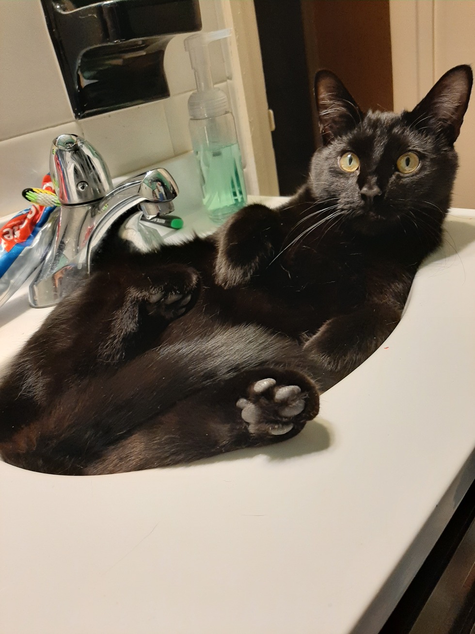 Silas was a Christmas present last year and the best present we could have gotten! He loves to be petted while eating and purrs uncontrollably. Silas is obsessed with his sister, Sophie, and sits outside the bathroom door and meows pitifully until she comes out. He's so soft and sweet. We are very lucky to have adopted him and he rounds out our 3 cat household perfectly!