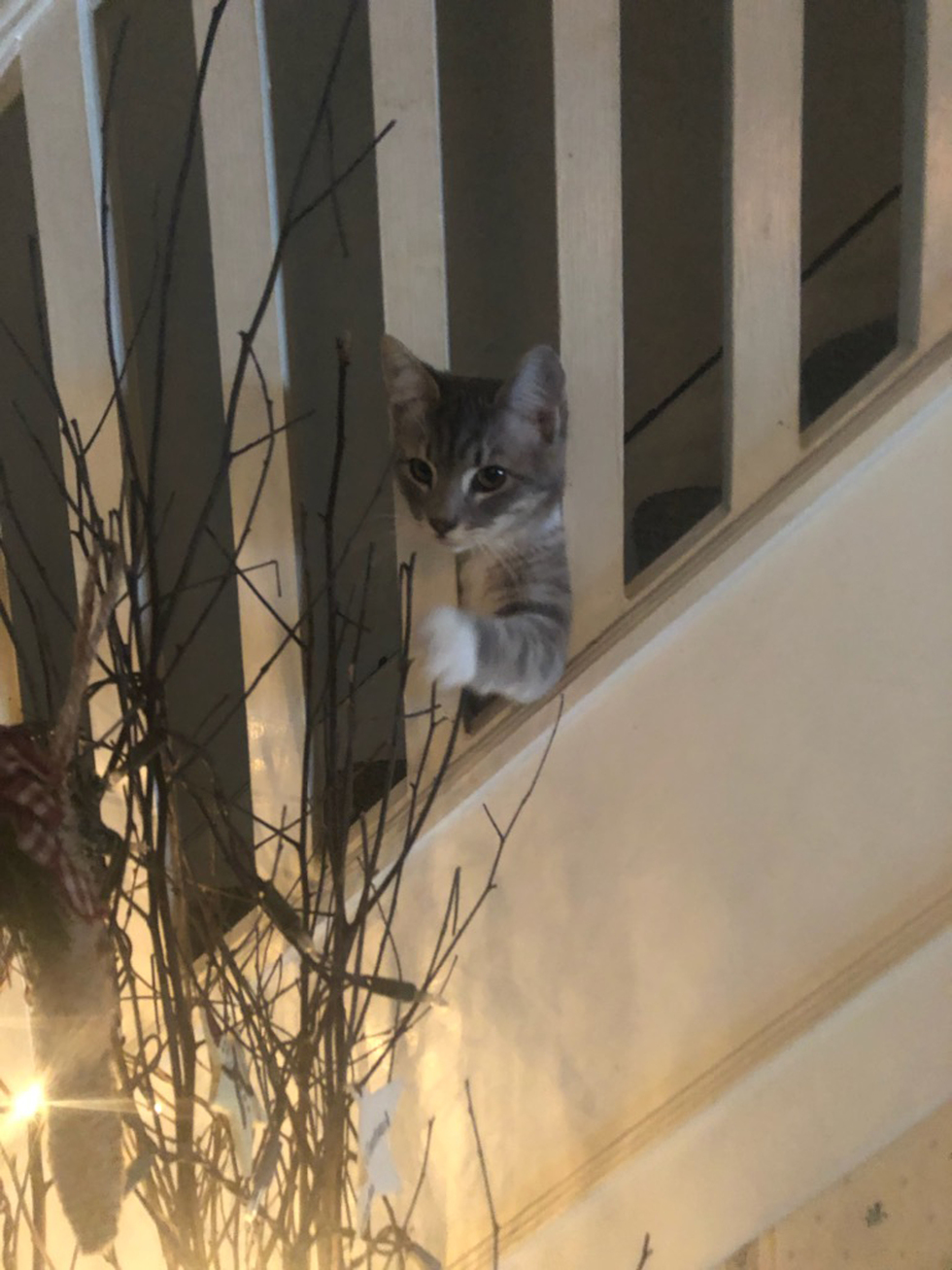 Lark is just a tiny little thing...but she loves to play big! Lark was abandoned by her mom and I found her hiding on my porch on a cold rainy night...scared, sick, hungry and all alone. I heard her cries and I took her in and she is the light of my life! I captured this photo while she was playing hide and seek with me and she thought it would be fun to also knock ornaments off of my decorative tree!