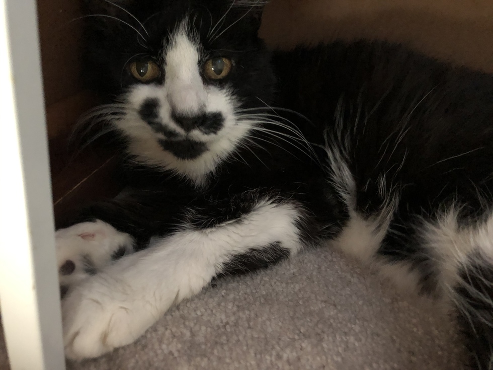 Moustacha’s name was inspired by her mustache! She is a 1 year old that we found alone under our deck. We began feeding her throughout the Summer last year. Eventually she would come to the front door every night and meow very loudly. She was saying “Hey! It’s my dinner time.” We realized she was quite dependent on the food we gave because she was so skinny when we met her. As the winter months approached we brought her in as our own. Soon enough we realized why she had meowed so loudly at our front door. Moustacha is deaf! She doesn’t come when we call so we’ve had to adjust our way of getting her attention. She spooks easily, as she doesn’t hear anyone walk up to her when she is sleeping. Moustacha is our wonderful special needs cat!