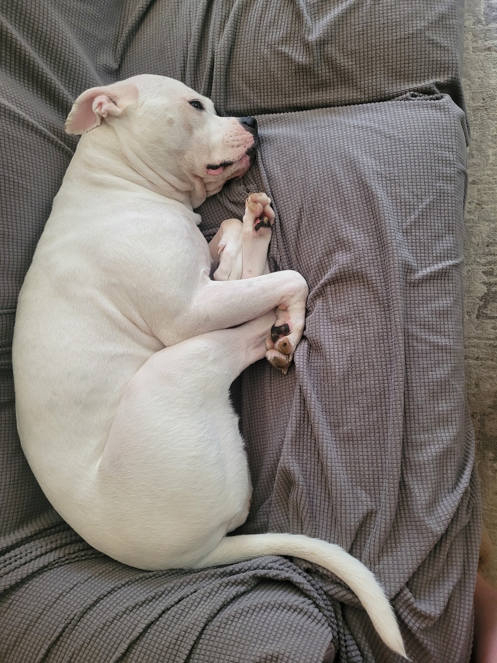 Rosie is a 4-year-old American Bulldog and the sweetest lil bean. She contains multitudes: looks like a tough guy (is a marshmallow); loves the outdoors (is allergic to everything); and can rough it with the best of 'em (cries if I forget to pull the duvet over her head at bedtime).