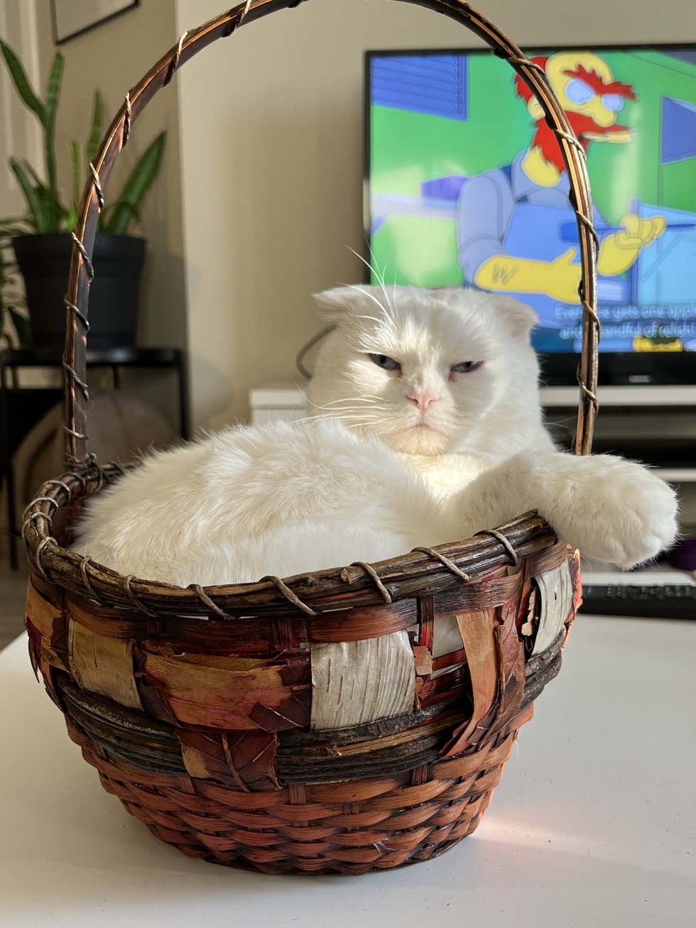 Gus, with his permanently grumpy expression, is a lovable prince of chill. He loves nothing more than to laze around in hidey holes, boxes, or baskets, snacking on churu tubes, and of course, taking many naps. A fashionista with a penchant for wearing bonnets or fruit-themed head hugging caps, Gus has also perfected his model « smize » during golden hour.