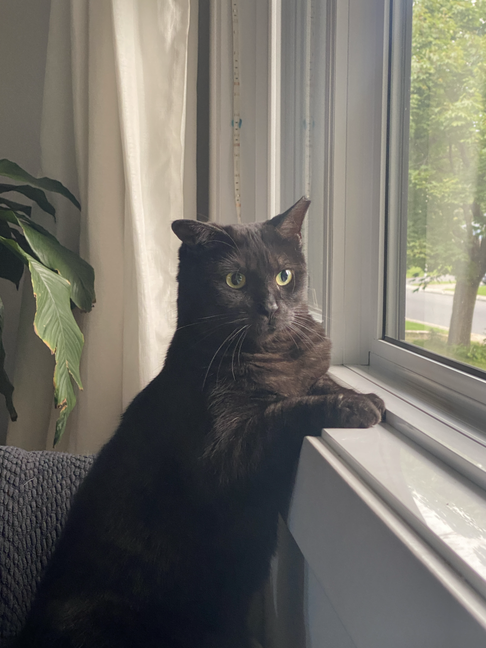 Once a wild spirit from a Northern Québec colony, now a velvet-coated chatterbox with the softest fur and a heart full of mischief. Despite losing most of his upper teeth, he hasn’t lost his charm—or his appetite for play. With his best friend Zoom, they merge into one mysterious, purring shadow by night.