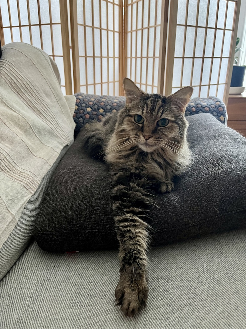 Wally is about 14 years old now. Initially rescued in an alley with his siblings, he was taken in as an a shy kitten by his first mom. He was then adopted at 9 and, within a year, he faced a near death experience. Following a frightening journey, side by side, the boy survived and has gone on to live his best life. He’s bright and sweet and will allow his little sister Pasha to groom him (although he has his limits and sets boundaries with her). He also knows the word “cookie” and enjoys head butts. He’s my little survivor and a wonderful companion. His nicknames include Nuni and Wally Nu.